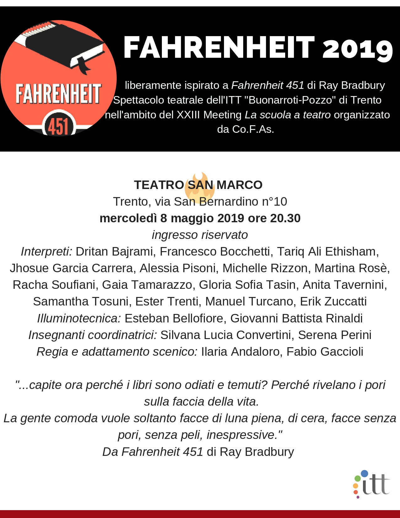 La rappresentazione al teatro San Marco è nell'ambito del 23° Meeting "La scuola a teatro" organizzato da Co.F.As. e dall'Assessorato alla Cultura della Provincia di Trento, spettacolo che verrà proposto ai compagni e alle compagne di scuola sabato 11 maggio nell'Aula Magna dell'ITT "Buonarroti -Pozzo" e giunge a completamento di un percorso e progetto teatrale partito a novembre nel quale gli studenti e le studentesse che hanno partecipato, guidati dagli esperti Ilaria Andaloro e Fabio Gaccioli, hanno potuto sperimentare una diversa prospettiva di sè e delle proprie capacità e possibilità ed hanno potuto avere una diversa visione della scrittura e della letteratura lontano da una lezione strutturata. Hanno anche sperimentato una possibilità di aggregazione e di scambio altra rispetto all'aula ed alla classe, arricchendo con importanti soft skills i ragazzi e le ragazze che vi hanno partecipato e cui potranno attingere in futuro. Lo spettacolo tratta di una società immaginaria collocata in un futuro distopico, che non sembra, per la verità, poi così lontana, i libri non vengono più letti, poiché ciò costituisce un crimine, bensì bruciati da un rigido corpo di pompieri asserviti al sistema, pronti a denunciare e arrestare qualsiasi ribelle colpevole di reato di lettura. In questo scenario poco rassicurante sono infatti pochi a possedere materiale cartaceo nelle proprie case, mentre la maggior parte della popolazione è succube della televisione e della radio, strumenti con i quali la dittatura diffonde la propria ideologia, calpestando la volontà dell’essere umano di preservare la sua libertà di pensiero. E’ al noto romanzo di fantascienza Fahrenheit 451, scritto da Ray Bradbury, edito in Italia nel 1953 con il titolo Gli anni della fenice, che il nostro spettacolo si ispira, traendo suggestioni anche dall’omonimo visionario film di François Truffaut del 1966. Lavorare su questi testi, sia quello letterario che quello cinematografico, ci ha permesso di riflettere su alcune tematiche che sentiamo calde, quali: il ruolo e l’importanza della lettura, l’influenza dei mass-media sulla libertà individuale nella società contemporanea, la pericolosità delle dittature totalitarie, l’assuefazione impassibile alla quotidianità, la necessità di preservare la propria umanità nella desertificazione emotiva e, soprattutto, l’eterna potenza sovversiva e vitale della cultura.